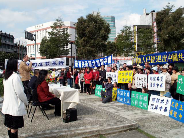 一月十四日中午,数百位民众齐聚在桃园市民族公园前,很多人手持斗大醒目的标语声援中国人民退出共产党。载满真相展板的宣传车则不断的在附近街道上绕行,向人们揭露中共对善良的法轮功修炼者的残酷迫害,尤其是活摘法轮功学员器官牟取暴利的滔天罪行。活动引起车潮及路过百姓的关注。