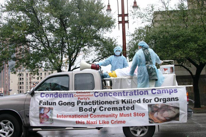 法轮功学员今年参加游行的主题是“揭露中共迫害,揭露中共活体摘取法轮功学员器官”。第一部汽车上面的手术台,模拟展示中共活体摘取法轮功学员器官的罪行,汽车两旁有英文横幅,上面写着“抗议中共活体摘取法轮功学员器官,呼吁国际社会终止中共纳粹的罪行”,还配有图形,将中共邪恶的本质暴露在光天化日之下。这一情形,震撼着观众的心:中共在中国到底干了些什么?另一部汽车上是法轮功学员展示“缓、慢、圆”的五套功法,与前面的迫害场景形成鲜明对比,引起了观众的深思:这么好的功法,为什么却在中国受到打压?
