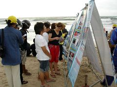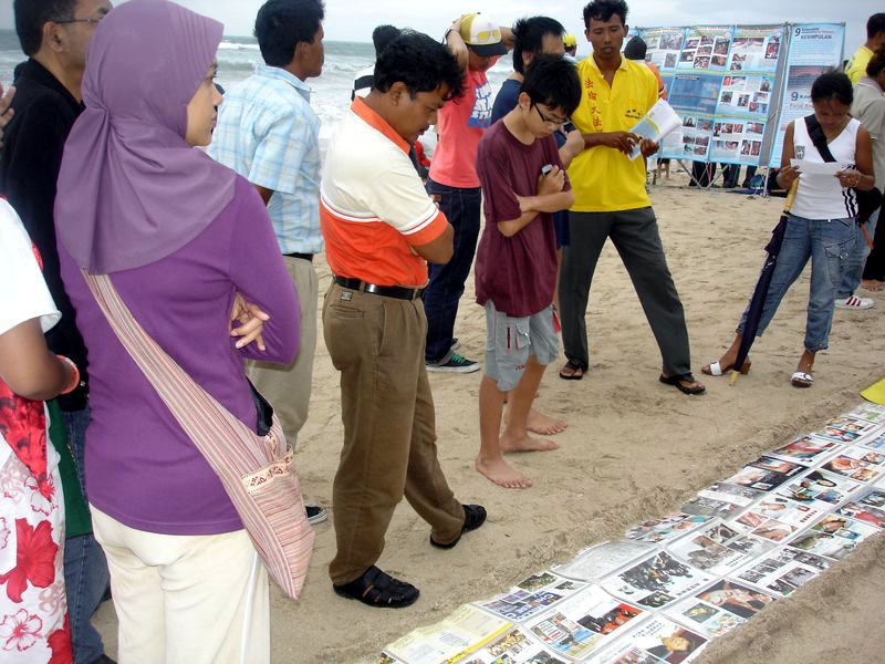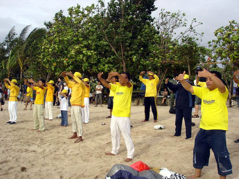 下午四点三十分左右,巴厘岛的学员们开始在海滩上举办各种讲真相活动。学员们首先表演了法轮功功法,优美的动作与海滩上陈列的残忍的迫害图片形成鲜明对比。海滩上同时还竖起了一块简要介绍《九评共产党》的展板。很多路人都被吸引过来,学员们借此机会向游客和过往行人发传单、讲真相。