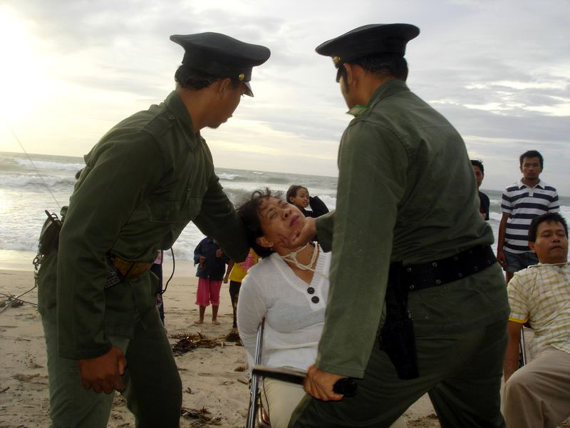 ![]() 印尼法轮功学员在巴厘岛库塔海滩演出短剧“黄沙浸血” |