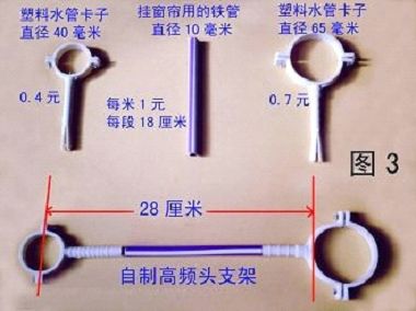 在120厘米正锅收亚洲3S和W5时,单本振的高频头直径有60和65毫米两种。其塑料水管卡子可根据单本振高频头直径配制60或者65毫米(在卖水暖管件和卫生洁具的地方可买到),正好卡两个高频头合适。