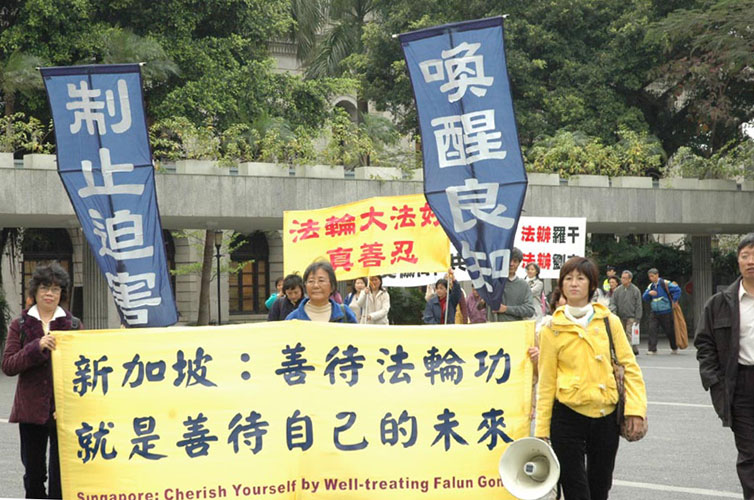 ![]() 香港法轮功学员游行前往新加坡总领事馆, 敦促新加坡当局不要充当中共的帮凶,立即停止迫害法轮功。 |