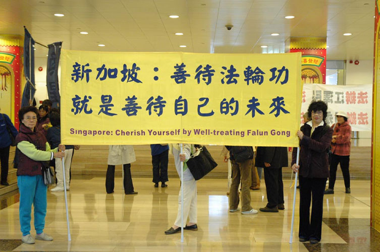 ![]() 法轮功学员在新加坡领馆所在大厦内张起横幅:善待法轮功,就是善待自己。 |