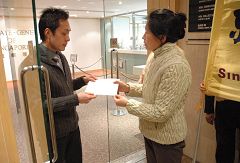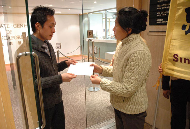![]() 法轮功学员向新加坡领馆人员递交抗议信。 |