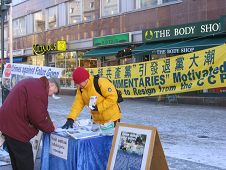 二零零七年一月二十日,是芬兰今年入冬以来少有的冷天气,但芬兰退党服务中心、大纪元义工及法轮功学员仍聚集位于东南部的城市高沃拉,在市中心的步行街打出中、芬文的“《九评共产党》引爆退党大潮”、“一千七百万中国民众退出中共”的横幅,同时展示揭露中共暴政及其如何对信仰真善忍的法轮功学员实施灭绝人性的迫害的真相图片。