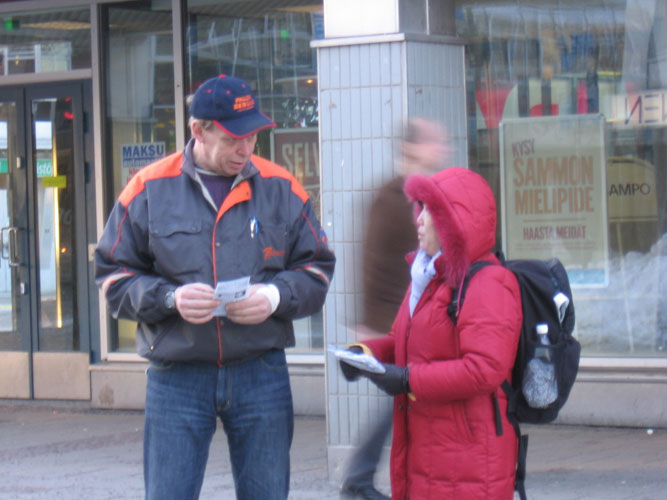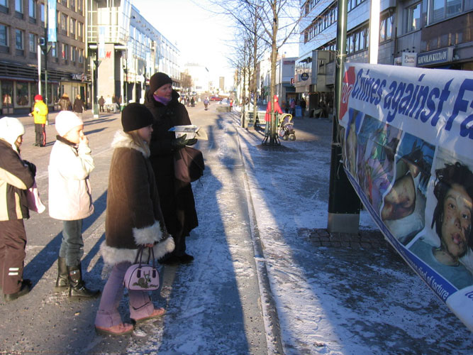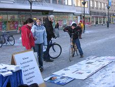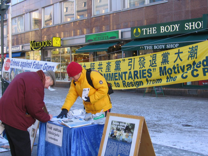 通过义工和法轮功学员的手,把一张张揭露邪恶中共罪行、讲述它七年多来对法轮功学员惨无人道的迫害,特别是活体摘取法轮功学员器官的暴行的传单递送到芬兰民众的手中。一些人看到传单、读过展板及主动了解真相后,说:谢谢,你们做的很好。有的问:我能帮你们做点什么?更多的人则是签名声援反迫害。