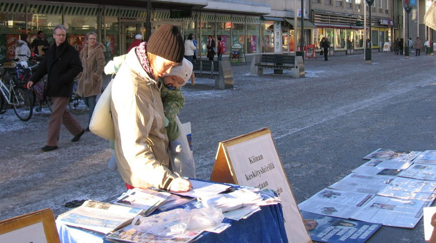 法轮功学员王芳在头一天得知母亲在中国东北再一次遭警察非法抓捕和抄家。她告诉自己要坚强,更要告诉芬兰人民她的妈妈就是一个普通的法轮功修炼者,想要按真善忍做好人,却在遭中共一年非法劳教迫害后再次被绑架。残酷的迫害每天都在大陆的许多法轮功学员身上发生着。只有揭露邪恶,才能制止迫害。当她一边向人们递传单一边讲诉时,一位老人给她出主意说:应该把你妈妈的事情写出来,到芬兰国会、到媒体、到警察局、到国际上去说,告诉他们这些残酷的事情正在中国发生着。一位芬兰女士问:你需要钱吗?我可以给你。几位小学生则表示无法理解,警察不是只抓坏人吗?中共的警察为什么抓好人呢?