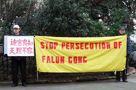 新加坡驻英使馆前集会 抗议秘密审讯法轮功学员(图)