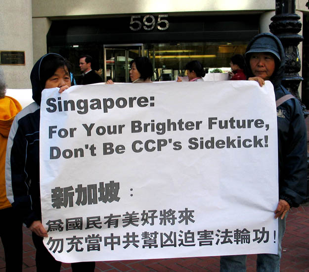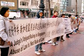 ![]() 部份湾区学员在新加坡驻旧金山领馆所在大楼前抗议其当局不公对待法轮功学员,并吁其停止协助中共恶党迫害法轮功。 |