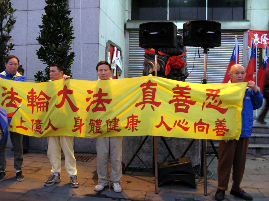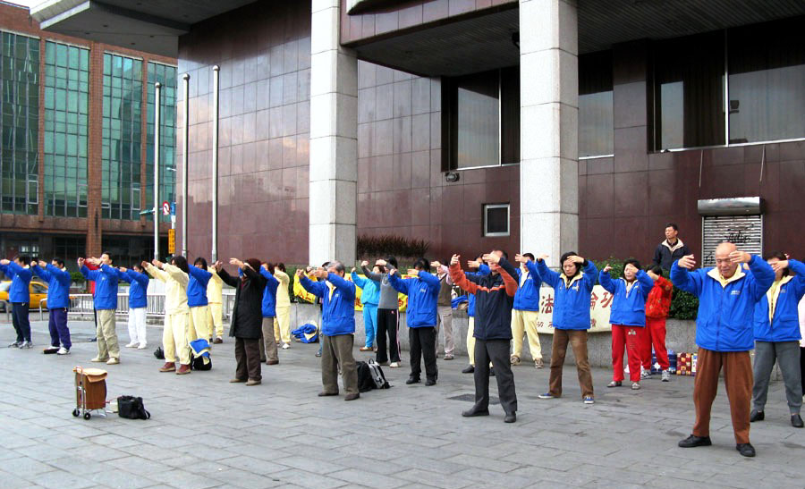 基隆市文化中心广场刚好是法轮功学员每天集体炼功的炼功点,为了洪法,基隆市其它炼功点的学员早上四点五十分也到此集体炼功。升旗前,许多民众已经陆续到达现场,并且看到法轮功学员炼静功。一边是法轮功学员集体炼功,一边是群众聚集参加升旗典礼,场面祥和。