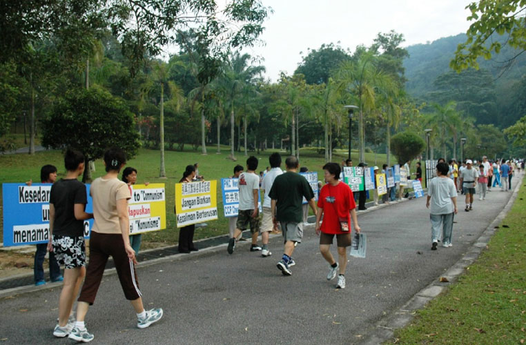 集会在早上七时半开始,民众举着展板筑起声援三退“长城”,给三退勇士打气。沿着公园人行道排列的九评图片展,给来公园运动、慢跑的市民一道新鲜的风景线,吸引了众多市民的目光。