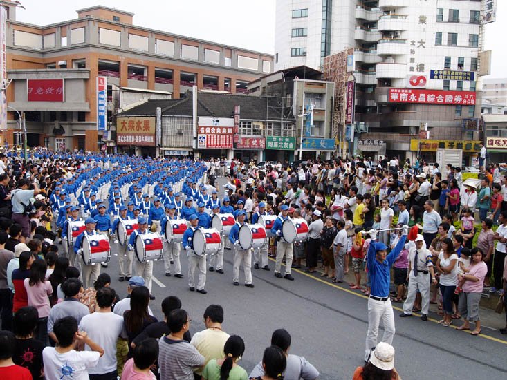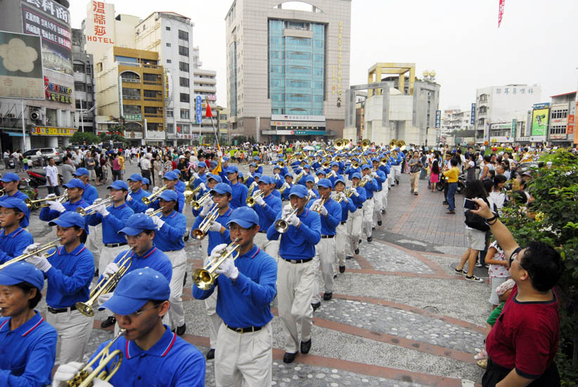 ![]() 众多踩街队伍中,法轮功的天国乐团是队伍中最为引人注目、最亮丽的一支队伍 |