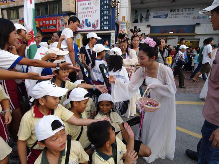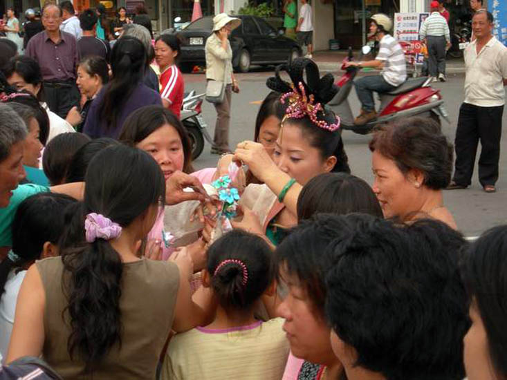 ![]() 热情民众将仙女团团围住,争相向仙女要挂着洪法书签的莲花 |