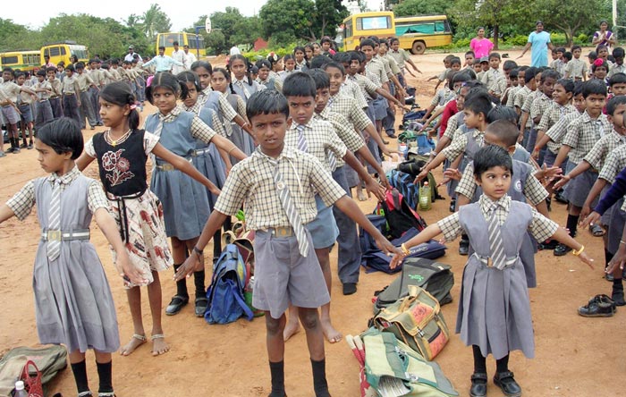 Srinivaspur终点站下车后,我们很快的被接到Byreshawara school,我们直接被引进校长室。校长ShriRama Reddy 先生早已在办公室等候我们到来。该校有一至十年级(一至五年为小学,六至十年为国中及高中,所以他们十年读完即可上大学),学生总人数总共二千多人。校长ShriRama Reddy本身也炼法轮功。