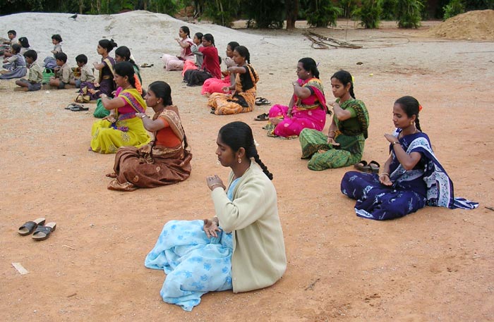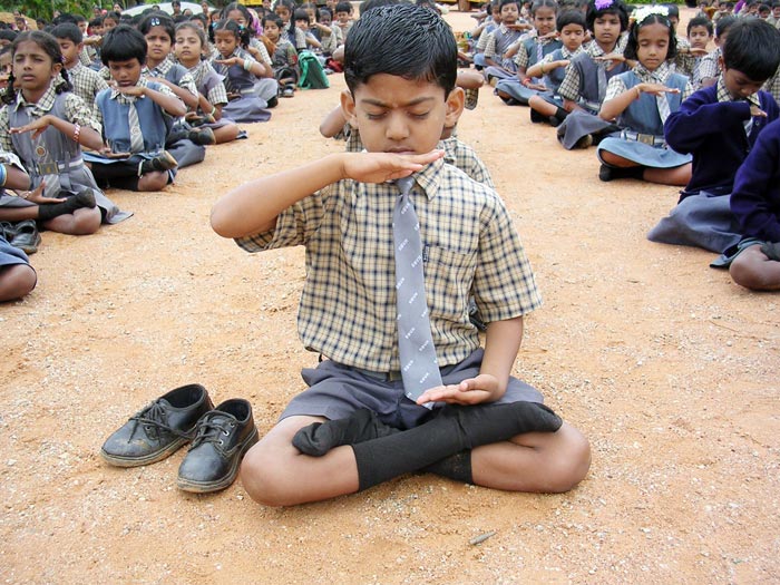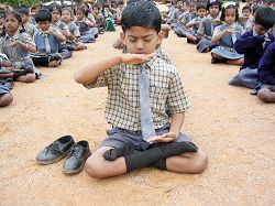学生看着Chitra讲解及台湾同修的动作,集体炼功。动作方面有些很标准,有些则很不一致,第五套功法中,有些做的很好,双盘很标准,有些怕痛盘上又放下来 。学生很可爱,尤其那一年级的小朋友纯真的模样,真是讨人喜欢。