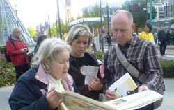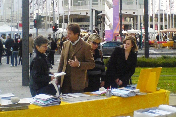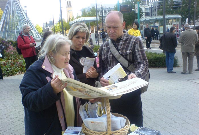 秋日清晨的寒气尚未退去,信息日的展台也还未完全摆好,学员们开始在音乐中炼功。一位怀抱各种书册的德国少女从旁经过,看到这神秘的东方文化,就蹲在地上一声不响、一步一挪的把配图的德文说明全部仔细读完,然后一个人安安静静的走到展台上去签名谴责中共的迫害、去领取各式传单。直到走前,才轻声对法轮功学员说:“我想把签名表也带走一张。我想跟我的亲戚朋友讲。可以吗?”