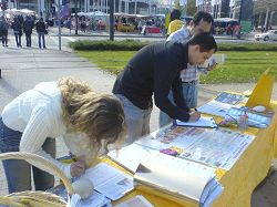 “法轮功?你是说,你们是法轮功?”一位先生刚听到一位法轮功学员的一句话,就大步走向展台。“你们要不要捐款?我要给你们捐款。”他一边说,就已经把钱包都拿出来了。学员向他说明,如果他愿意帮助法轮功,可以签名反迫害,我们不向民众收捐款的。他愣了一下,二话不说,马上签名。原来他是一位博士,从媒体报道中早已知道中共迫害法轮功的真相。签完名,他又详细的向曾经被中共非法关押过的法轮功学员询问了劳教所里的迫害情形,最后,他握着这位学员的手说:“您讲的深深的打动了我的心!我祝福您和您的朋友!我希望你们成功!”