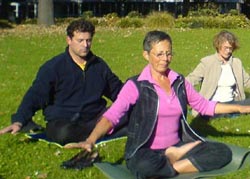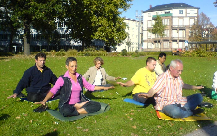 ![]() 拥有不同的经历和背景的德国法轮功学员正在展示法轮功的第五套功法 |