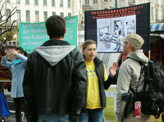 很多的华人看到法轮功学员的展板、横幅后,都大声的说“法轮功,法轮功”。很多人接过了学员递来的法轮功真相传单和《九评共产党》。一位中国女士在听到关于中共迫害法轮功的真相后,对学员说“这不就是气功嘛,中共这样镇压,他们(中共)真有神经病。”还有的中国人说在电视上已经看了《九评共产党》了。一位维也纳当地人在听了真相后,主动取走德文的《九评共产党》小册子。