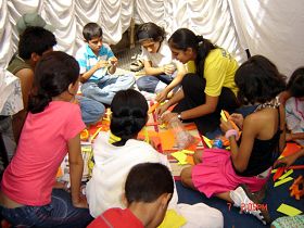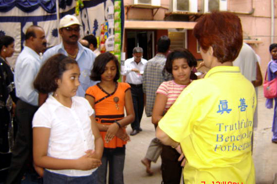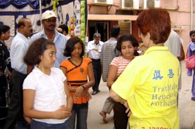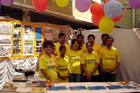 法轮功学员的展位上挂起了横幅:欢迎所有的人了解法轮功。普度和济世音乐为现场带来了祥和、安宁的气氛。一些人前来学习功法;孩子们对莲花着了迷。他们在学会了折叠莲花后才离开。