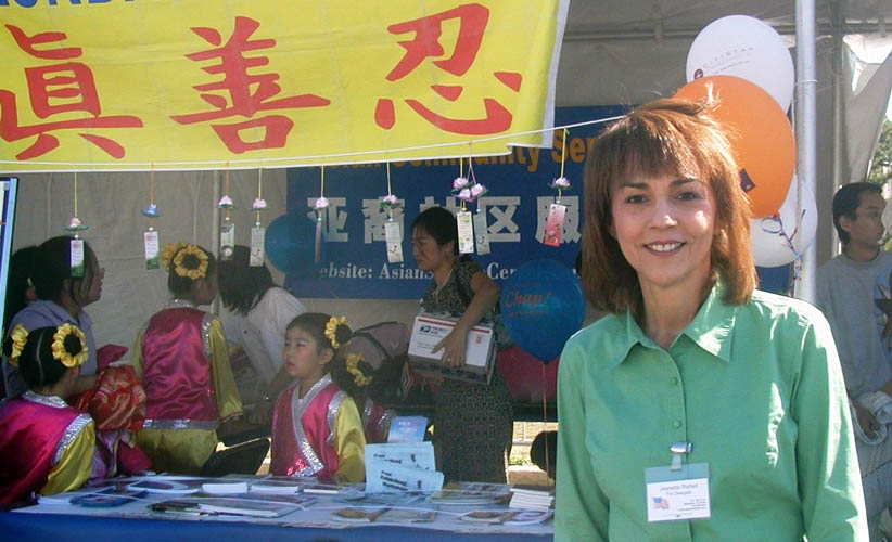 几位当地的议员候选人争相在法轮大法展位前留影。准备竞选维吉尼亚州第五十选区州议员的民主党候选人简妮特•瑞谢尔 (Jeanette Rishell)女士特地来到法轮大法展位前,她尤其认同“真、善、忍”原则,她说多元共处需要忍让和包容。她希望更多的居民都能遵循“真、善、忍”原则。