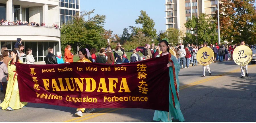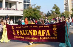 法轮功学员是第一次在这所大学的返校节露面,伴随着音乐“普度”,花车所经之处,观众们都睁大了眼睛,兴奋而又喜悦的喝彩。看到打横幅的学员穿的仙女服时,很多观众赞叹:“好美啊!好漂亮的服装!” 一个美国学生双手合十,用中文大声的对法轮功学员说, “你好!” 一个可爱的小朋友在远处伸手拽着父母的衣服,指着法轮大法的队伍要他们快看。很多观众伸出手来,等待发资料的学员将介绍法轮功的传单送到手中,接到传单后他们纷纷表示感谢。游行后马上就有人打电话询问要学功,还有人打电话想要更多的了解这个功法。