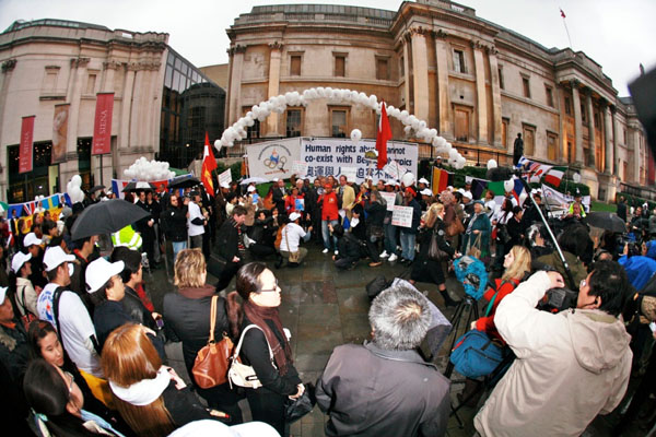 新闻发布会后,多位政要及发言人士前往伦敦鸽子广场(Trafalgar Square,又译特拉法加广场)的北面平台(North Terrace)迎接人权圣火并点燃英国的圣火火炬。在广场等候圣火的还有英国民主中国阵线,中国支持联合会,自由西藏,缅甸运动等多个民间人权团体及各界民众逾百位人士。人们打出了“没有人权就没有奥运”,“支援中国人民办一个没有中共的奥运”等中英文标语。