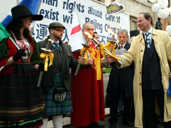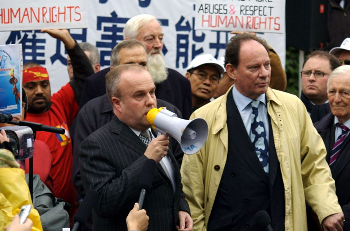 ![]() 英国上议会议员希尔顿勋爵在人权圣火传递仪式现场发言 |