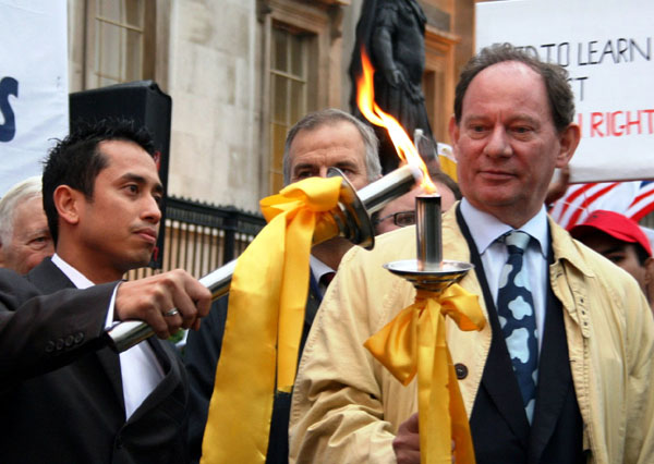 人权圣火抵达广场后,圣火传递使者首先点燃了大伦敦地区议会副主席科尔曼手中的圣火火炬。然后,科尔曼议员与欧洲议会副主席麦克米兰-斯考特、前奥运会田径运动员约翰•拜考特和前奥运会游泳运动员伽弗瑞•杜拉潘丹,分别点燃了身穿民族服装、代表英国的四个组成部份:英格兰、苏格兰、威尔士及北爱尔兰的四位使者手中的火炬。