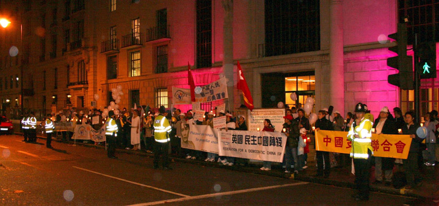 ![]() 在中共大使馆前举行烛光守夜,抗议中共迫害人权 |
