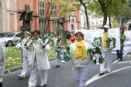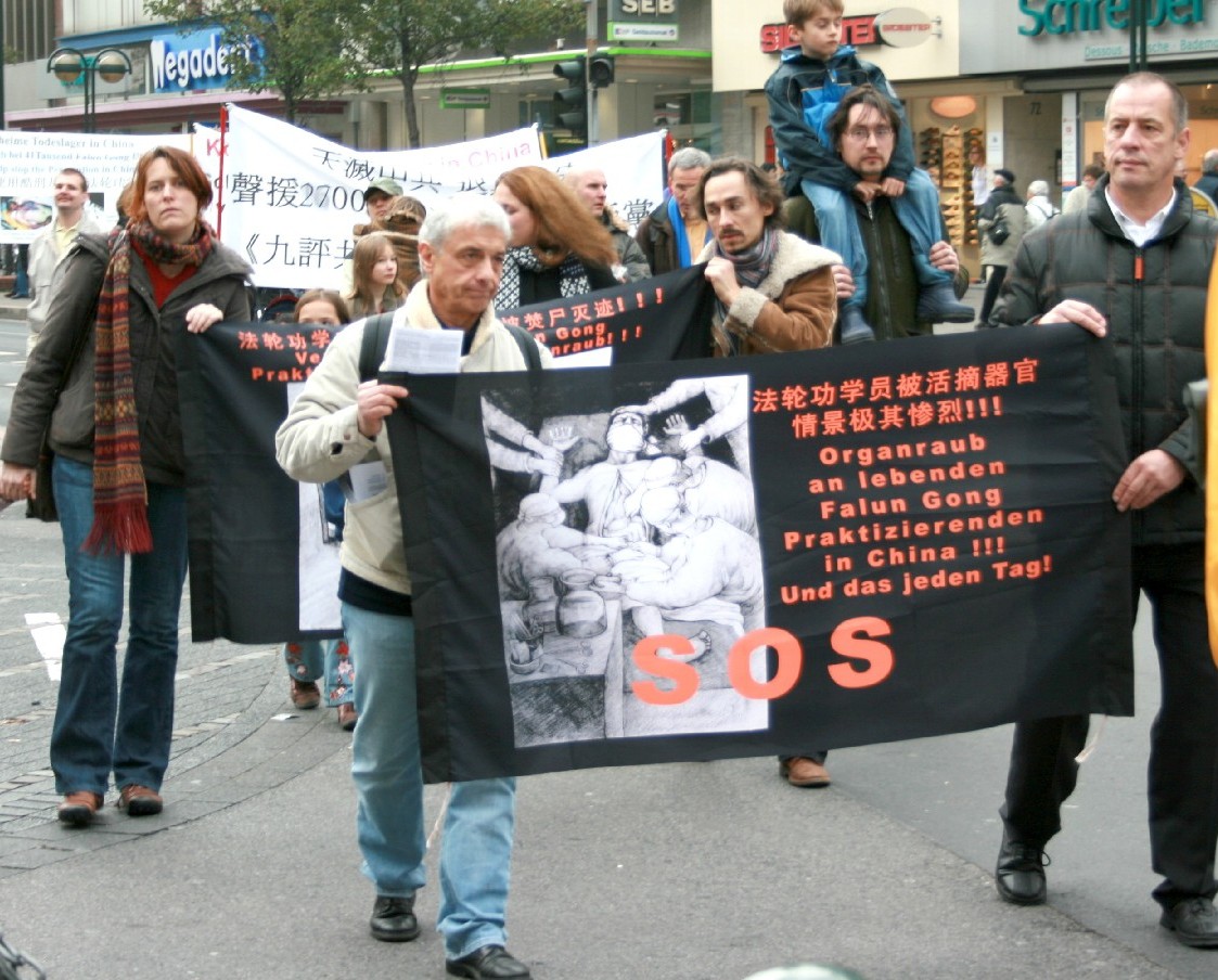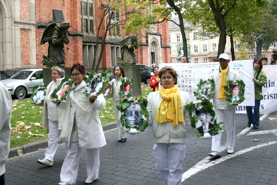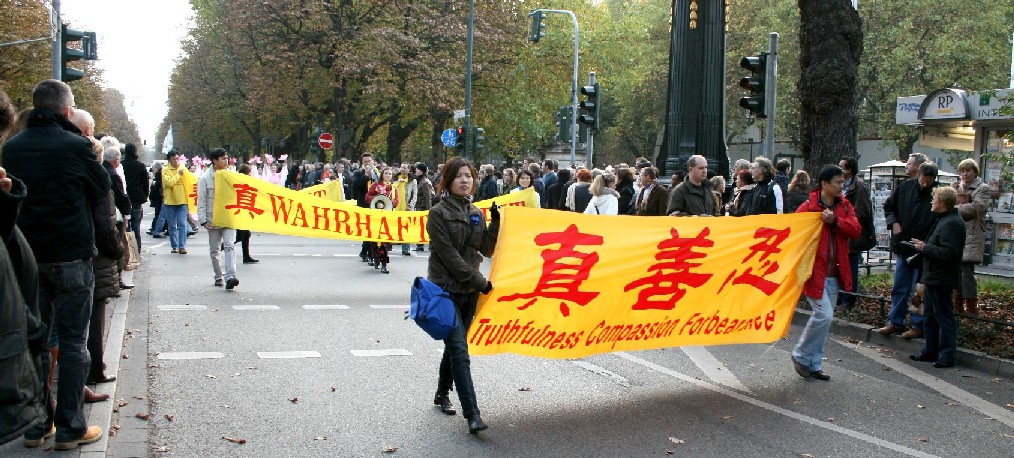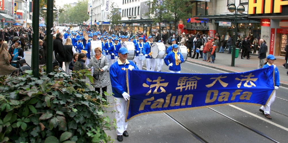 法轮功的游行队伍由欧洲天国乐团开道,包括“真善忍”横幅、揭露中共活体摘取法轮功学员器官的图片、介绍《九评共产党》和退出中共大潮、仙女队和腰鼓队等队形,在杜塞尔多夫最繁华的大街上举行了为时三个半小时的游行和集会。所到之处,人们无不驻足观看,不少人为天国乐团鼓掌叫好。很多人接到了传单,了解法轮功被迫害的真相,非常震惊。不少人签名制止中共迫害法轮功。