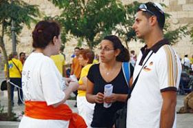 游行结束后,法轮功学员们在耶路撒冷的著名旅游景点——老城墙继续表演功法,发真相资料,向人们讲清中共迫害法轮功的真相。一些媒体的记者采访了法轮功学员。