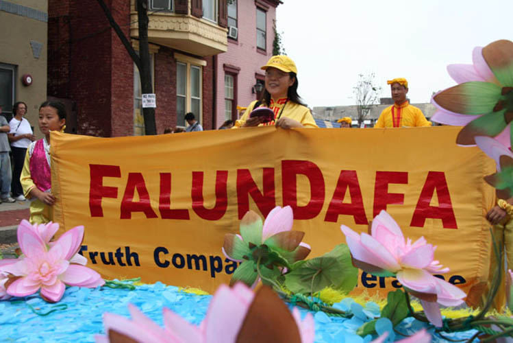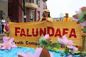 花车上,中英文的“法轮大法”横幅在鲜花的映衬下格外醒目,不同族裔的法轮功学员演示功法,几名身着中国传统服饰的华府明慧学校的大法小弟子向观看游行的人群招手,随后是法轮功学员组成的腰鼓队,鼓声阵阵,赢得沿途观众的热烈掌声和喝彩。
