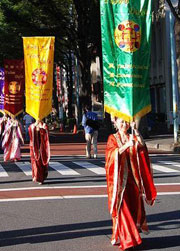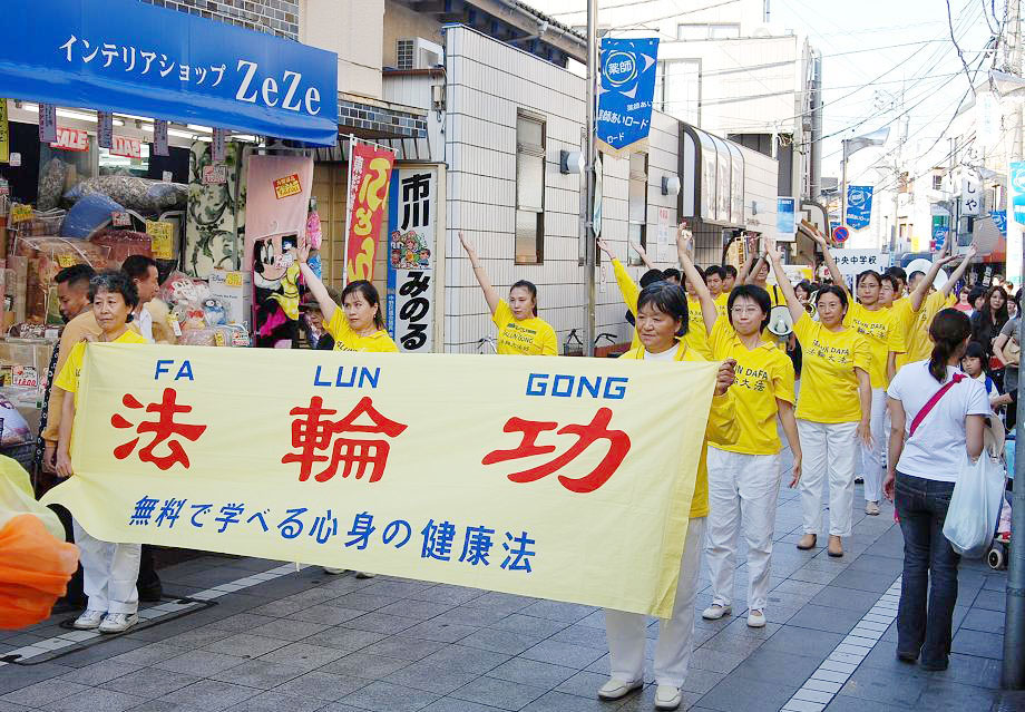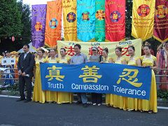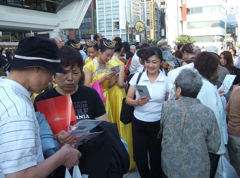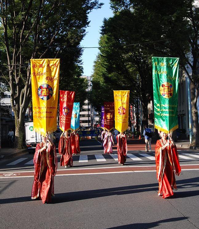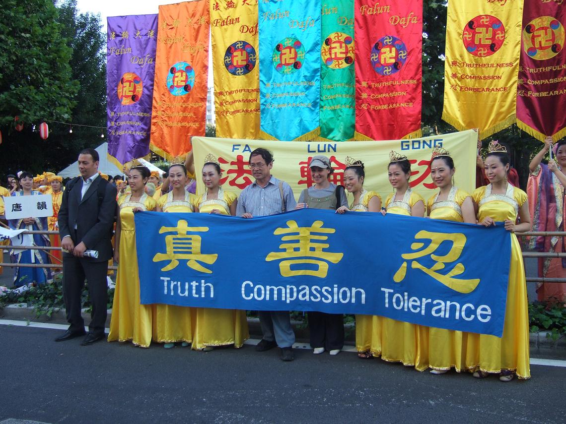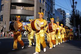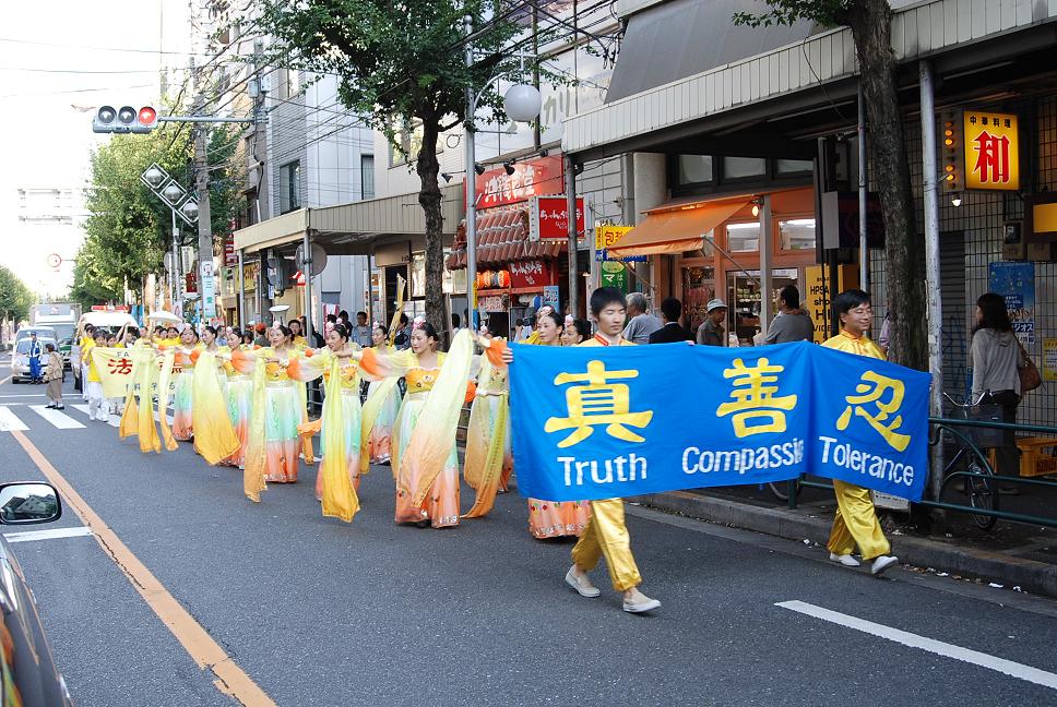 中野区位处东京政府新宿附近,是日本人口密集度最高的地区。法轮功学员的演出预告,早早就出现在节日庆典活动的宣传材料和网页中。本次中野节游行队伍有三十个团体的一千多人参加。法轮功学员组成了太鼓队、唐装队、仙女队、法轮功功法表演队四个方阵,队伍最前面是大型横幅“法轮大法-FALUN DAFA”,之后是威武雄壮、鼓声震天的太鼓队,然后是手持大法旗帜的唐装队,接下来是横幅“真善忍”和随着美妙音乐而翩翩起舞的仙女队,最后面是横幅“法轮功”和身穿黄色T恤衫表演功法的学员们。法轮功学员的队伍以威武而华丽的阵容博得了主办单位和观众的好评。