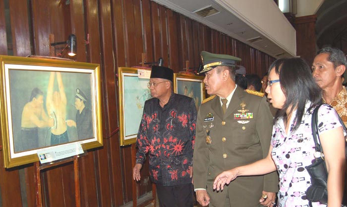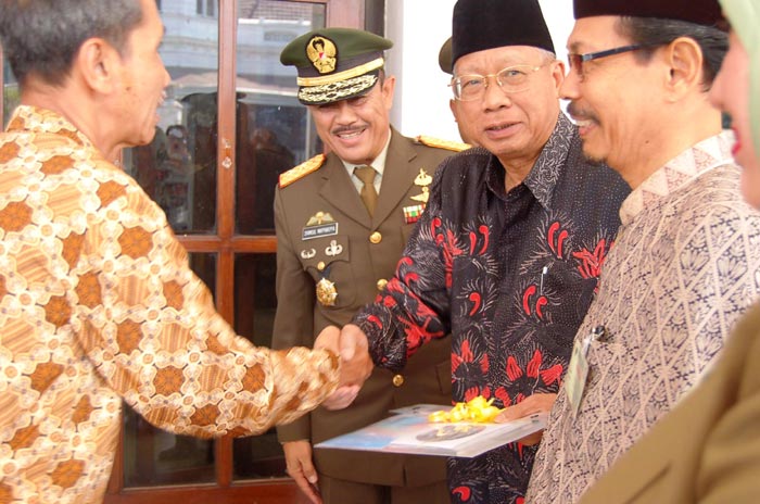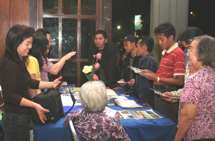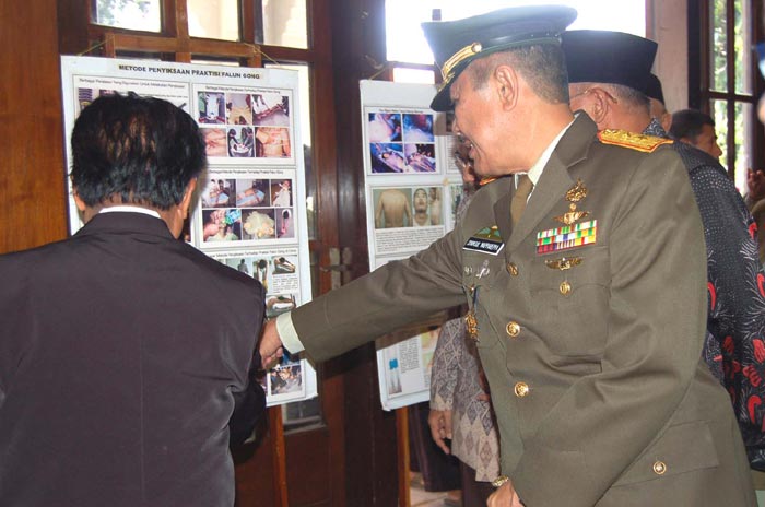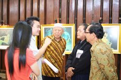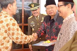 ![]() 印尼第五军区柏拉伟佳雅总司令祥素勒•马巴瑞巴〔左二〕以及东爪哇地区的回教委员领导人阿杜勒•梭码特〔左三〕分别接受了泗水法轮功学员所赠送的纪念品。 |