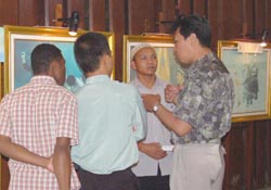 ![]() 法轮功学员向前往参观的观众讲解画作 |