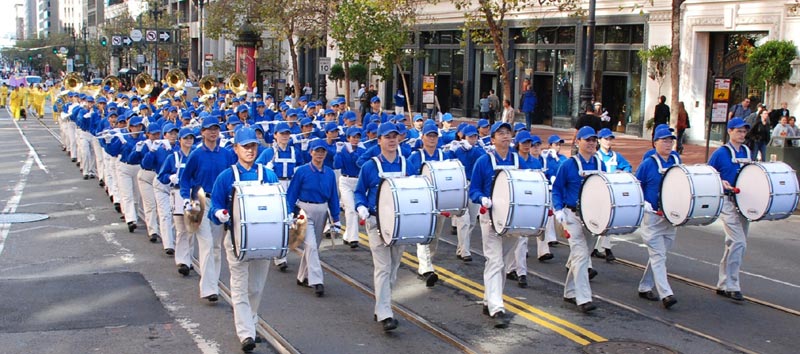 ![]() 法轮功学员组成的天国乐团行进在队列中 |