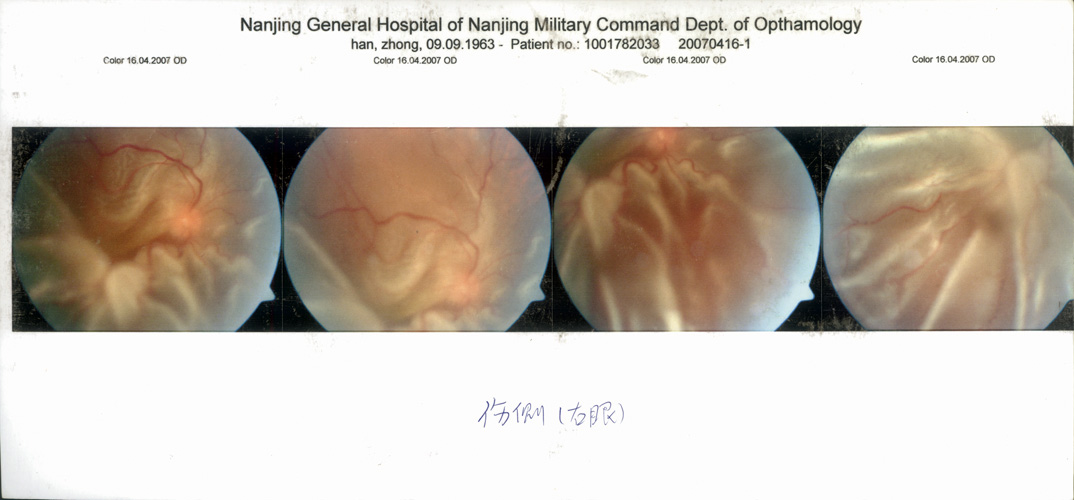 之后,直至零七年四月,狱方一直不给韩忠检查受伤的眼睛,也不给予任何治疗。韩忠曾多次提出要到医院检查、治疗;恶警们不但不予理会,反而多次殴打韩忠。到了零七年四月五日,韩忠才得到检查,证实右眼已经失明。