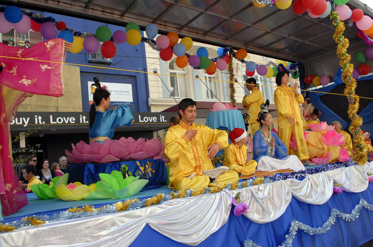 ![]() 法轮功学员精心装饰了花车,并演示功法 |