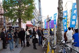 ![]() 东京都议员吉田康一郎在游行队伍中带喊口号 |
