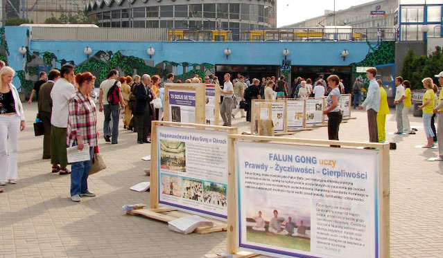 ![]() 波兰法轮功学员在华沙市中心揭露中共邪恶迫害的真相图片展吸引数千的民众 |