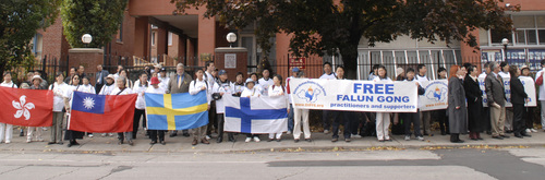 ![]() 抗议者们站在多伦多中领馆外谴责中共迫害法轮功。 |