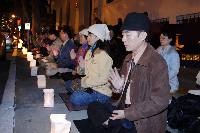 法轮功学员在中领馆前点燃蜡烛,横幅上写着“法轮大法好”、“呼吁制止中共残酷迫害法轮功”等标语。