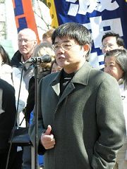 途中,突然听到有人说中文:“给我一朵莲花,我要挂在车子上。”原来是一位导游带着中国大陆游客参观游行,他也象其他人一样伸手向法轮功学员抢着要莲花书签。拿到莲花后,他高兴的拿给身旁目瞪口呆的中国游客看,并表示要挂在车上。