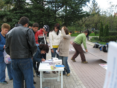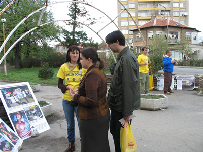 一名当地记者和一位年轻男孩整天都和学员们在一起,帮助发送传单并和路人交谈。这名就读于索非亚大学的男孩表示他想到炼功点上学炼功法,那位记者表示会将法轮大法的真相资料交给他的同事,而他本人则在卡赞勒克的互联网上发布相关讯息及照片。