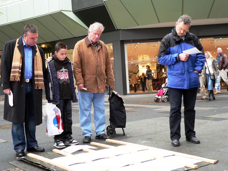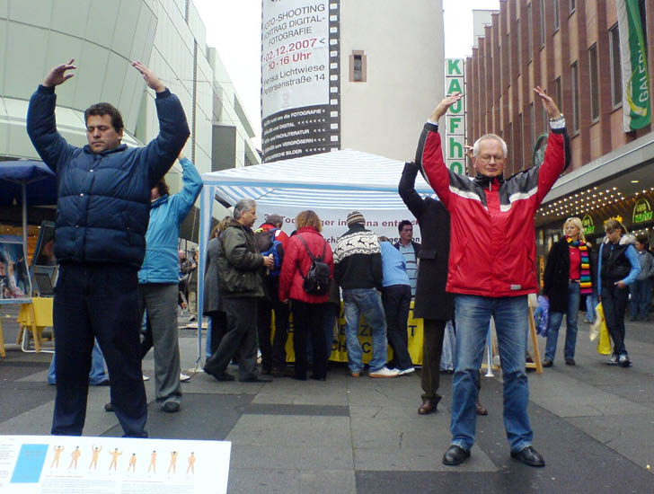 ![]() 一位有着祖传手艺的德国木匠(前排左,着蓝衣者)和一位曾在北美工作了近二十年的退休工程师(前排右,着红衣者)分别来到这里,为的是告诉人们法轮大法的美好,呼吁制止迫害法轮功。 |