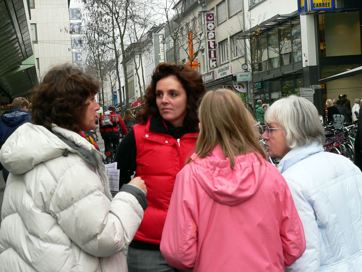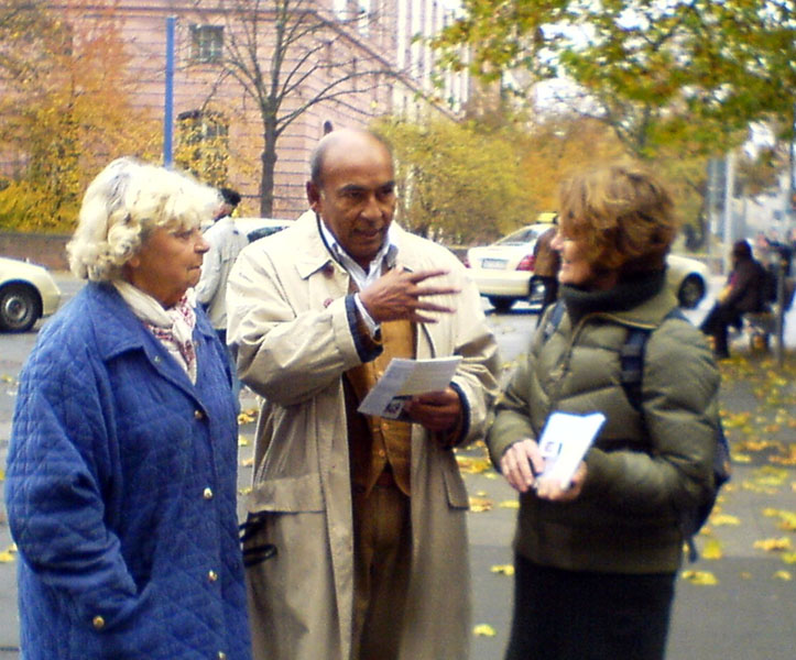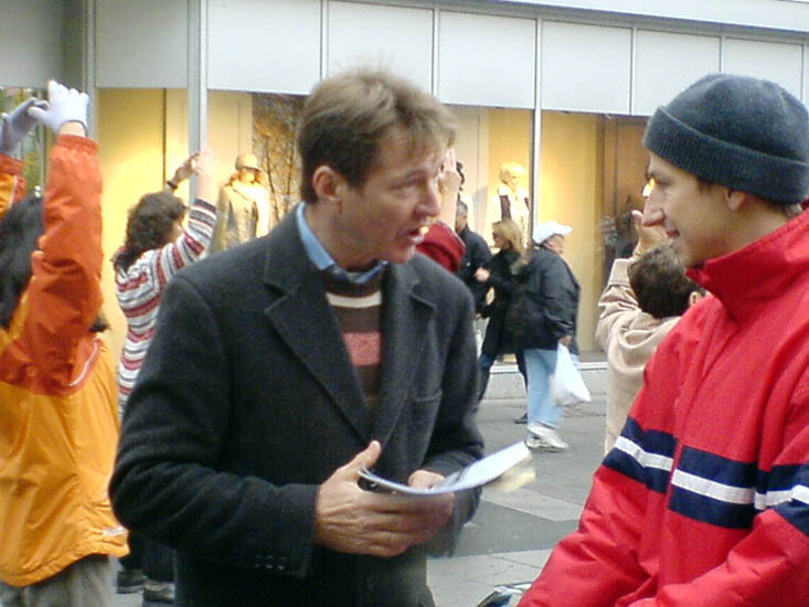 ![]() 一位德国女学员(右一)正在和路人谈论传单上的真相。这位热情、开朗的女士在德国开始修炼法轮功后,精力充沛、充满活力。她曾自费到非洲去洪扬法轮大法,就在那里她还遇到过中共特务的监视和跟踪。 |