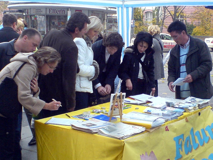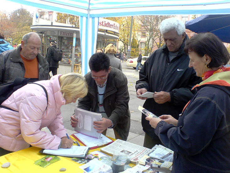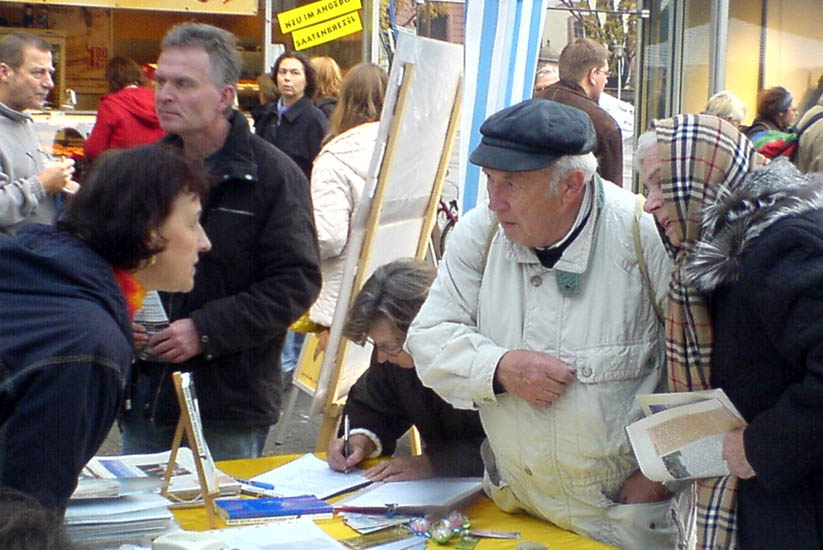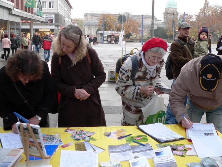![]() 签名支持法轮功,呼吁制止迫害!信息台前一整天人来人往,络绎不绝。许多明白了真相的德国民众做出了正义善良的选择!很多人还纷纷鼓励和祝福法轮功学员! |