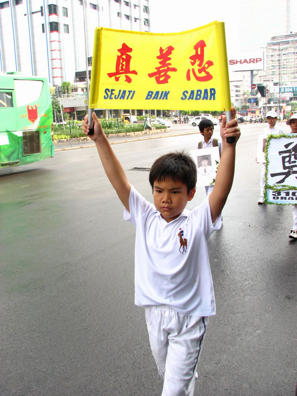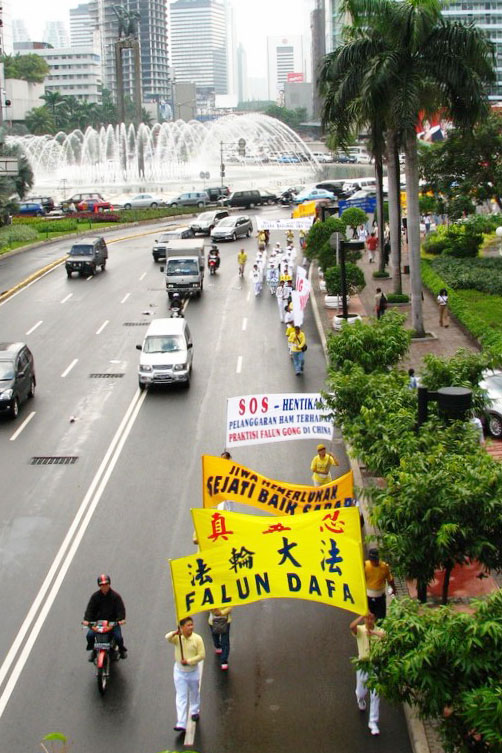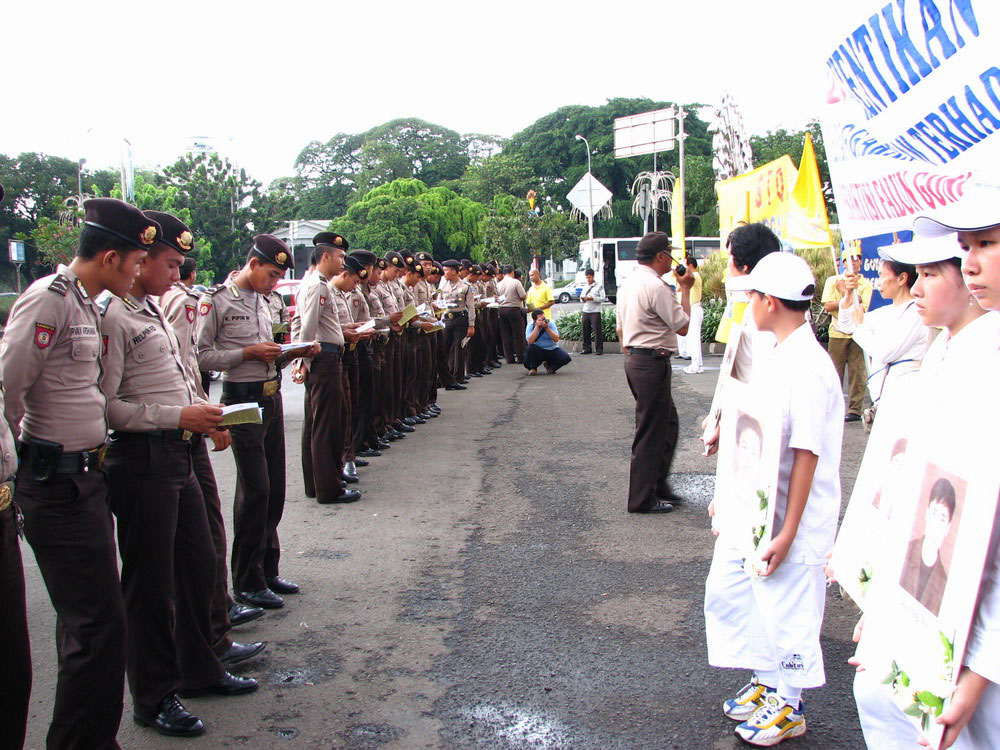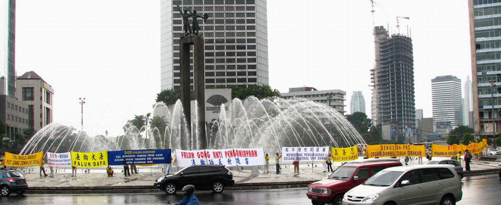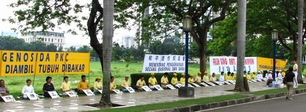 上午十点,法轮功学员首先来到雅加达中使馆前拉开横幅,静坐炼功,“呼吁制止中共迫害法轮功”、要求“停止活摘法轮功学员器官”。