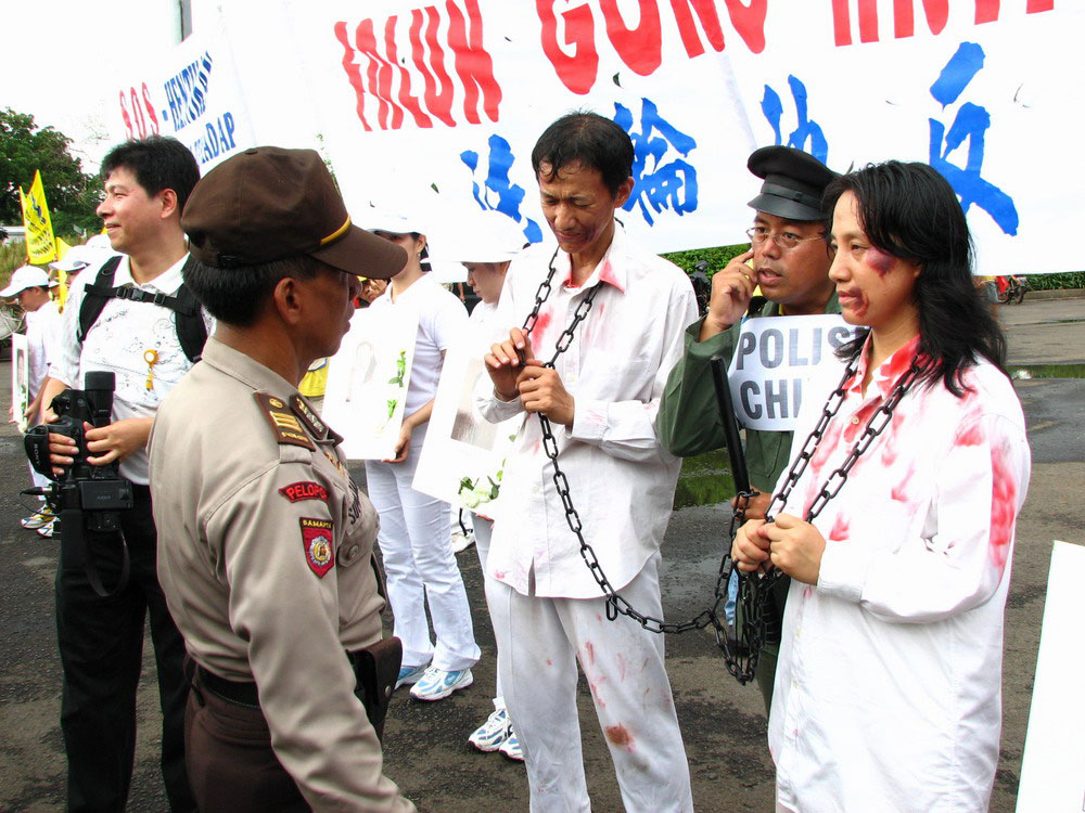 下午一点,法轮功学员来到印度尼西亚旅馆喷水池,展开横幅、手拿被中共迫害致死的法轮功学员相片、现场模拟演示中共用以迫害法轮功修炼者的酷刑,那醒目的横幅、肃穆的相片、血腥的酷刑,引起过往的车辆及路人关注。